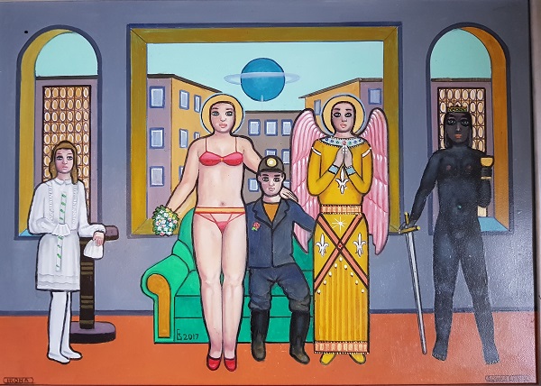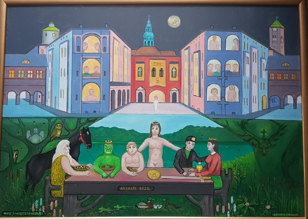 ERWIN SÓWKA (ur. 1936 w Giszowcu, zm. 2021 w Katowicach) – przyszedł na świat w rodzinie górniczej, we wczesnej młodości rozpoczął pracę jako górnik w kopalnie „Giesche” (później „Wieczorek”). Trzydzieści pięć lat przepracował pod ziemią, przeszedł na emeryturę w 1984 r. W latach pięćdziesiątych zaczął uczęszczać na zajęcia ogniska plastycznego w Katowicach. W 1956 r., za namową Ewalda Gawlika, wstąpił do grupy malarzy nieprofesjonalnych przy Zakładowym Domu Kultury KWK „Wieczorek”, w ten sposób dołączył do twórców Grupy Janowskiej. Prze całe życie konsekwentnie doskonalił swój warsztat malarski i rozwijał się duchowo. Jest to doskonale widoczne w jego obrazach. Od 1984 r. poświęcił się wyłącznie malarstwu, cały czas był czynnym i płodnym artystą. Najbardziej zauważalną cechą jego malarstwa jest fascynacja kobietą, którą ukazuje najczęściej w formie aktu. Artysta sam mówił o sobie, że największą przyjemność sprawia mu malowanie „gołych bab”. Co ciekawe, scenerią tych aktów jest najczęściej architektura jego ukochanego Nikiszowca (szyb Carmer, kościół św. Anny, rynek z arkadami, familoki, budynek poczty ze słynną mozaiką z motywem róż, itd.), wykorzystuje też w nich symbole i mity górnicze.